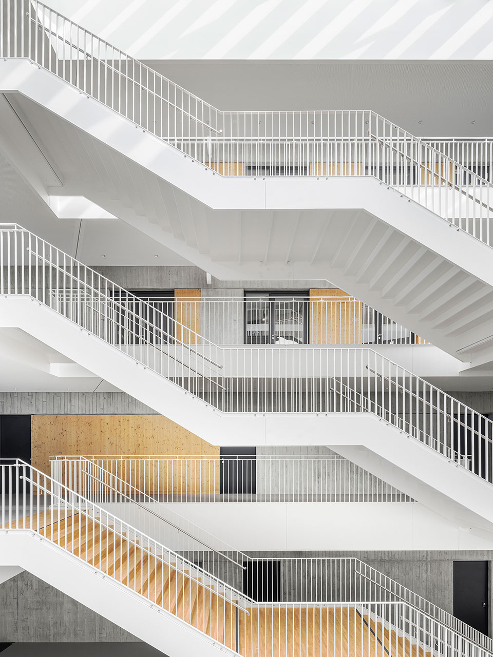 Die vier Jahrgänge befinden sich als zusammenhängende, überschaubare Cluster im dritten und vierten Obergeschoss. Erdgeschoss und erstes Obergeschoss nehmen die Ganztagesbetreuung und den Verwaltungs-/Lehrerbereich auf. Alle Geschosse sind räumlich über zwei viergeschossige Hallen miteinander verbunden, die Tageslicht in die Innenbereiche bringen.
